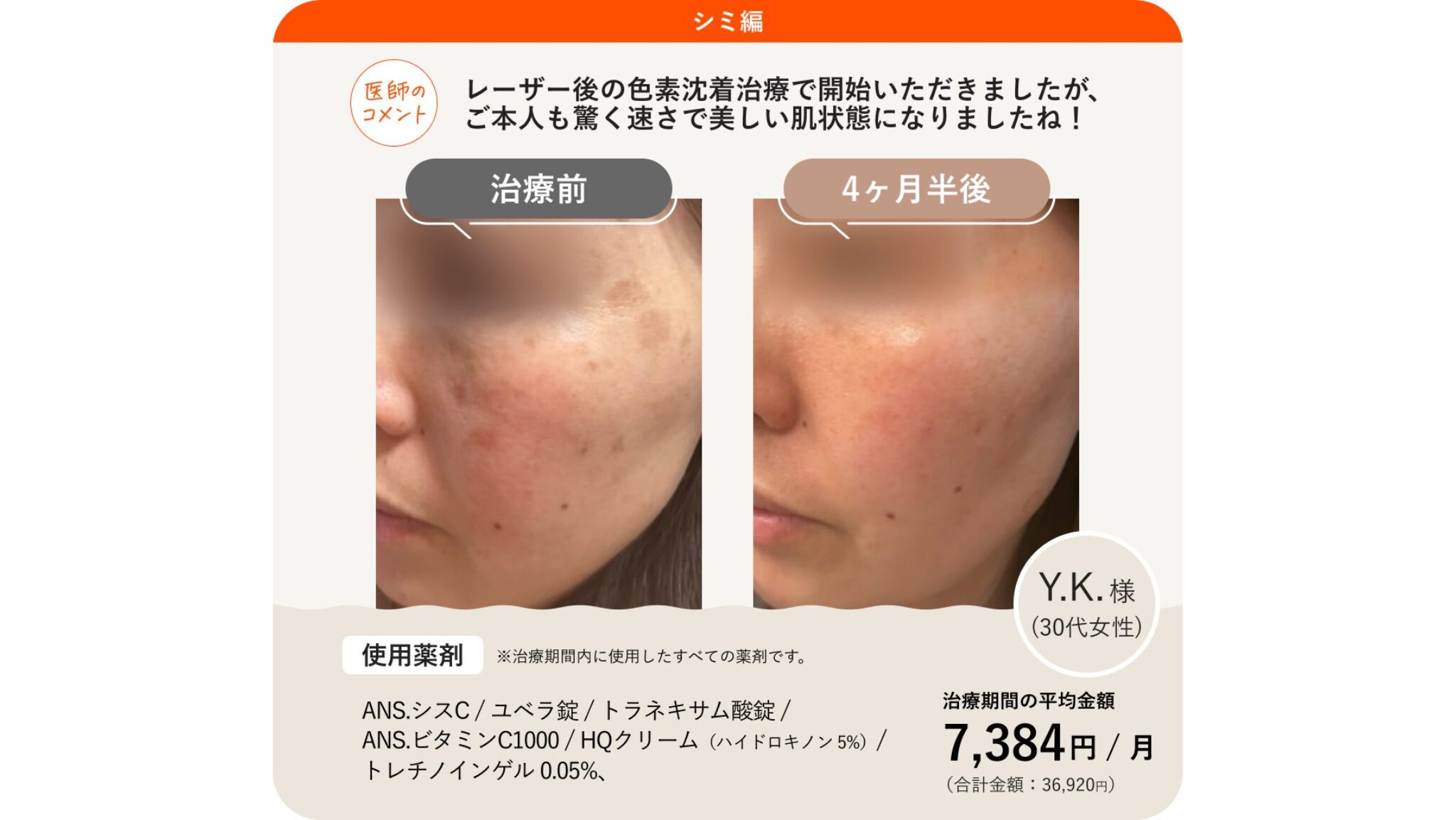 - シミ治療:4,600円/月(ツヤっと潤う透明素肌を目指す)