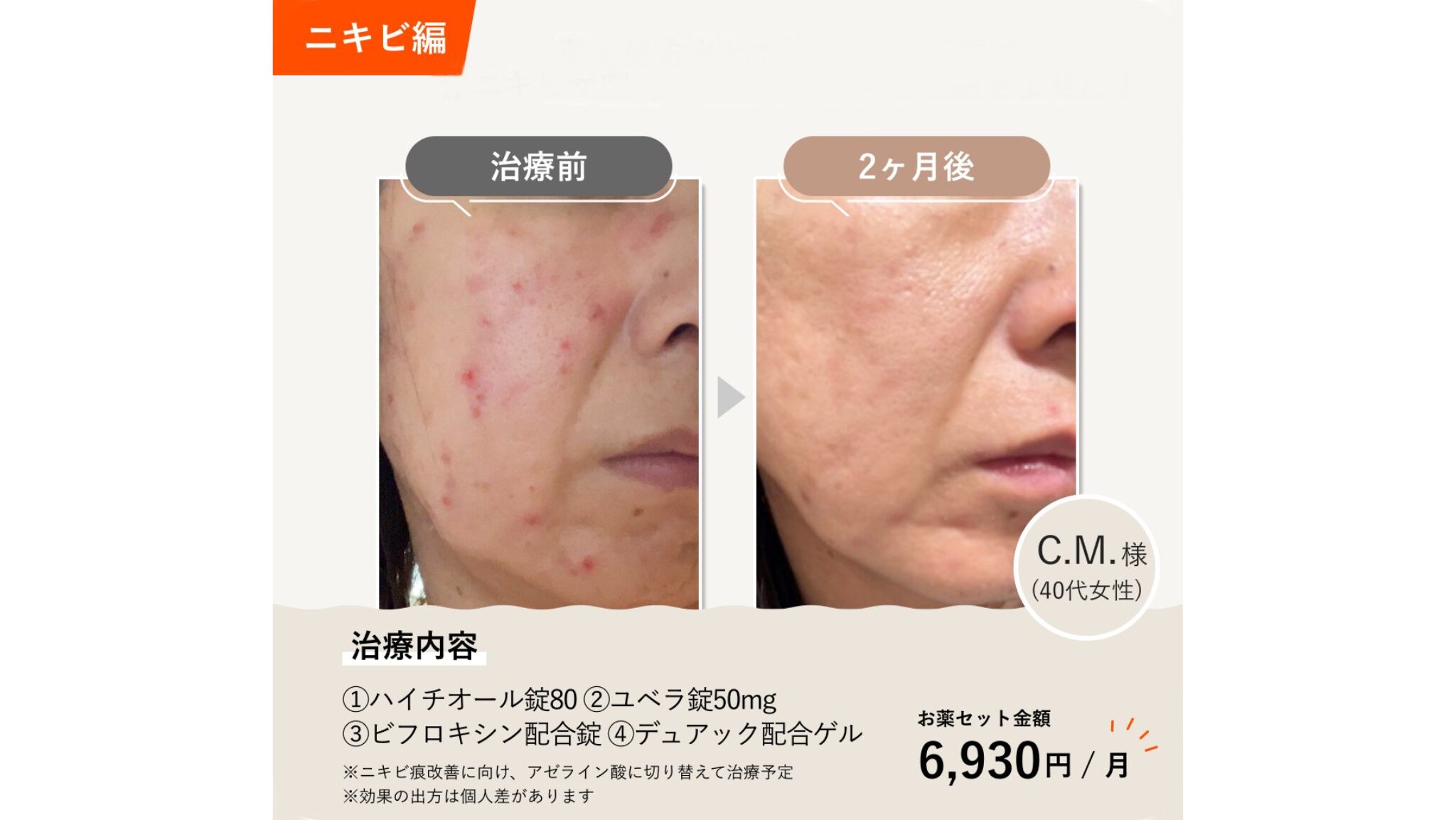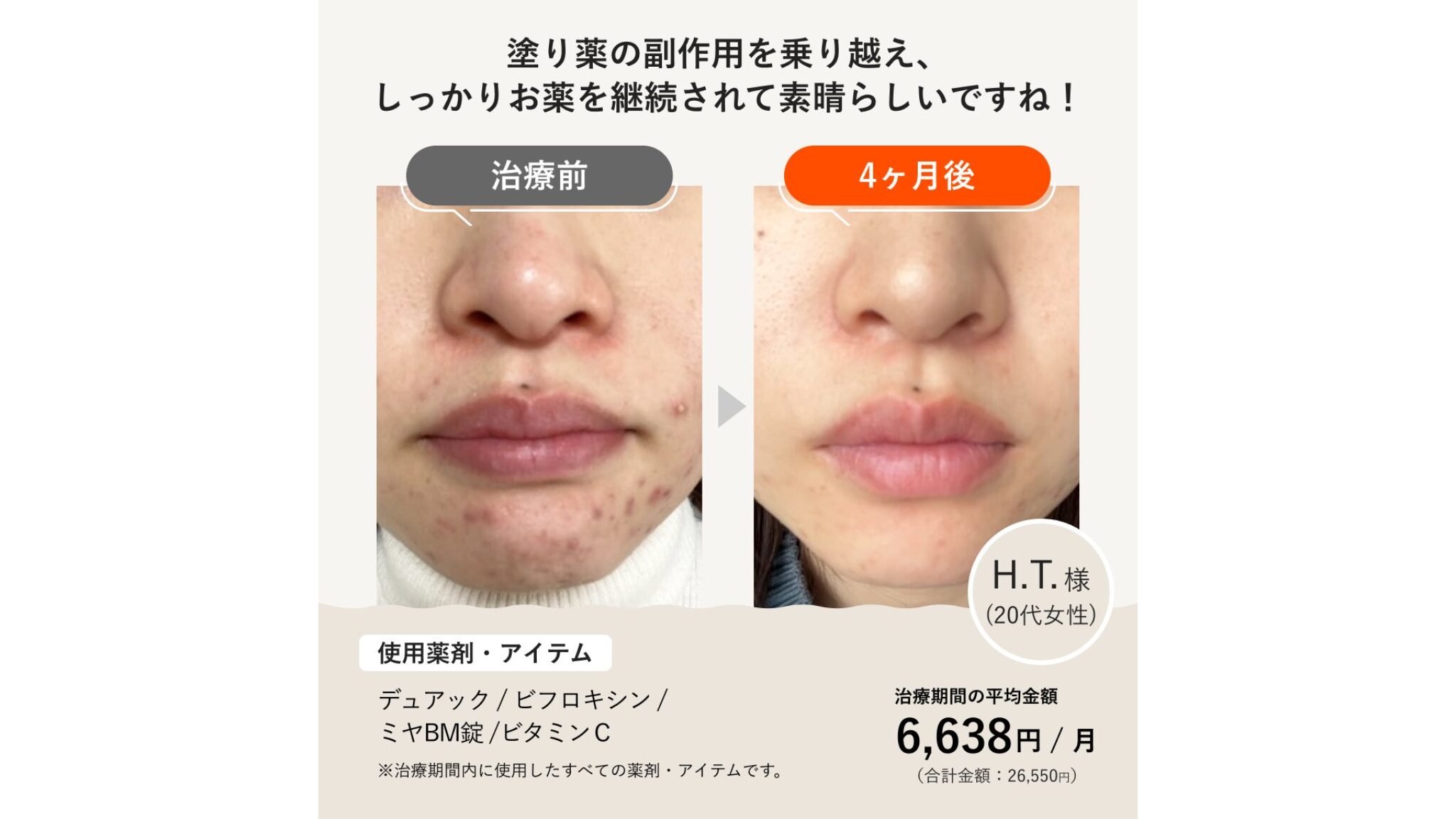 ただし内服治療は即効性があるものではなく、3ヵ月〜半年ほどかけて、少しずつ肌の土台を整えていくイメージになります。