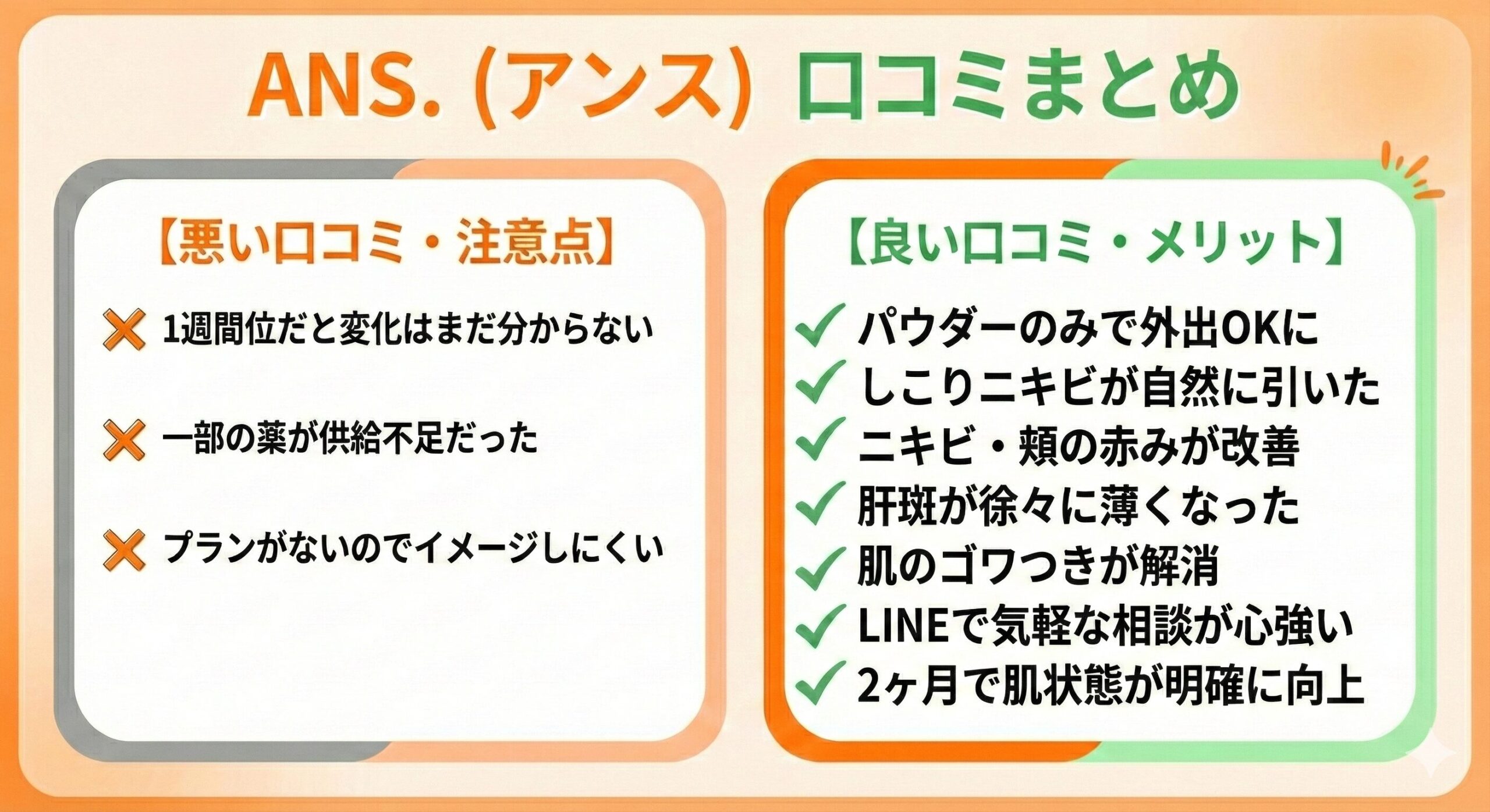 まず結論からお伝えすると、私はANS.(アンス)のおかげで、今まで散々悩んできたニキビ・肌荒れがほとんど気にならなくなりましたし、特に怪しいと感じる点もないですね。