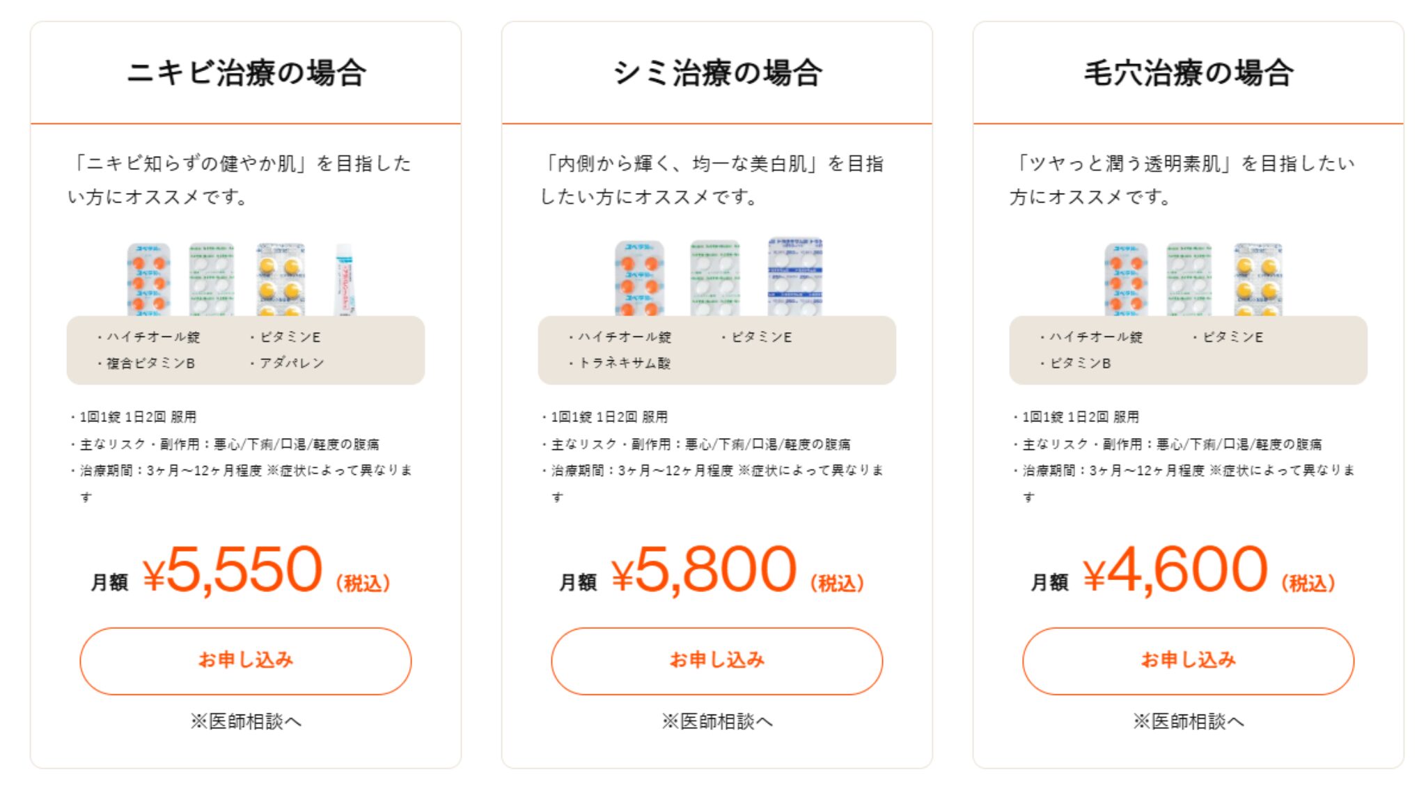 ★★☆☆☆ | 普通 | ・美肌セット:7,040円 ・美白対策:8,580円 (診察料:0円/送料:550円) |