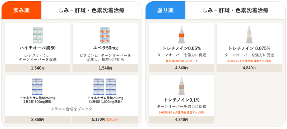 「内側から輝く、均一な美白肌」を目指すべく、シミの改善&シミができにくい肌作りに最適な内服薬を組み合わせているのが特徴ですね。