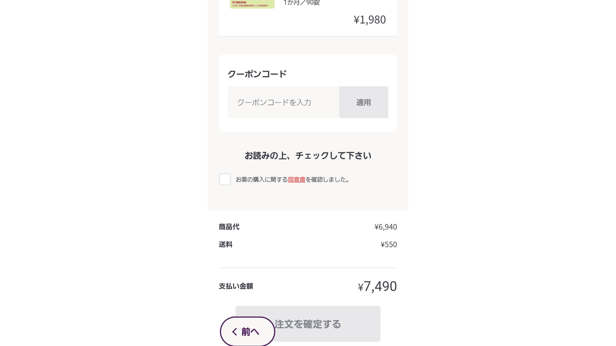 最後に値段を確認すると、3種類の処方薬が1ヵ月分で6,940円、そこに送料の550円が追加されて7,490円でした。