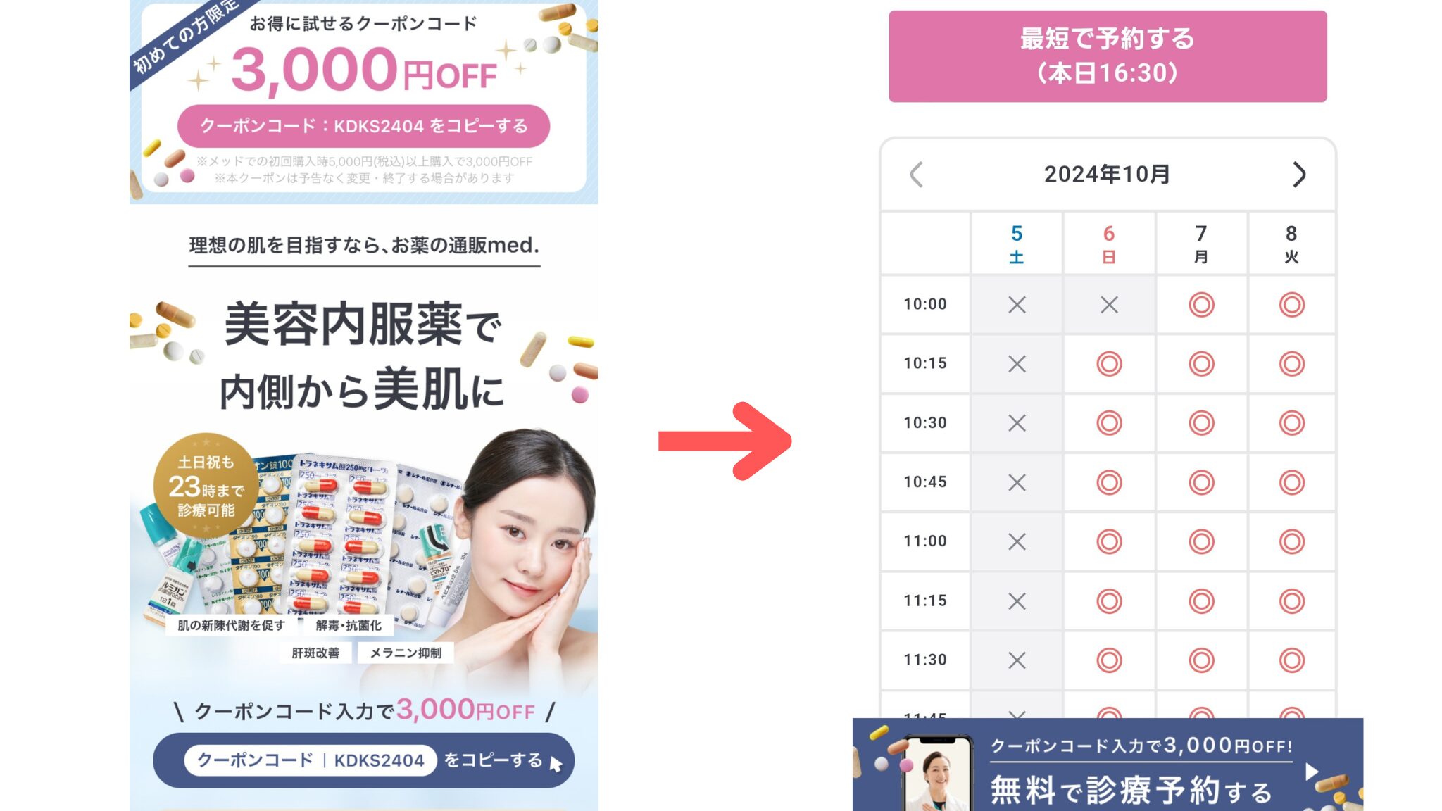 初回3,000円OFFのクーポンを使って、とにかく安さ重視で美容内服を始めてみたい方は、下記の公式サイトをチェックしておきましょう!(単月・単品での処方も可)