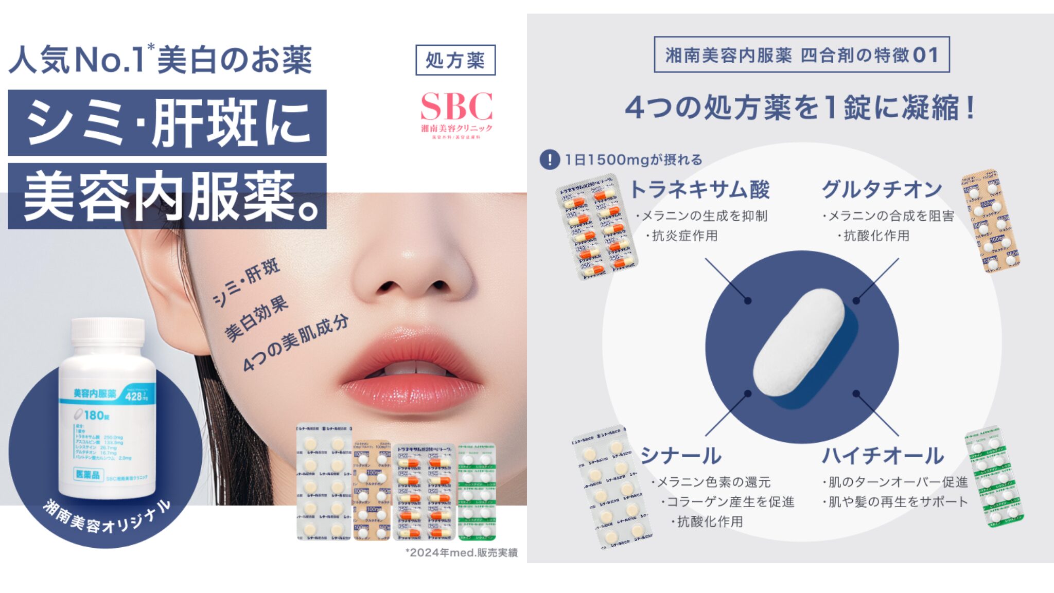 また湘南美容オリジナルの四合剤(トラネキサム酸・グルタチオン・シナール・ハイチオールの4成分が1錠になった気No.1商品)もとにかく優秀なので、美白を極めるならこれを飲んでおけば間違いありません。