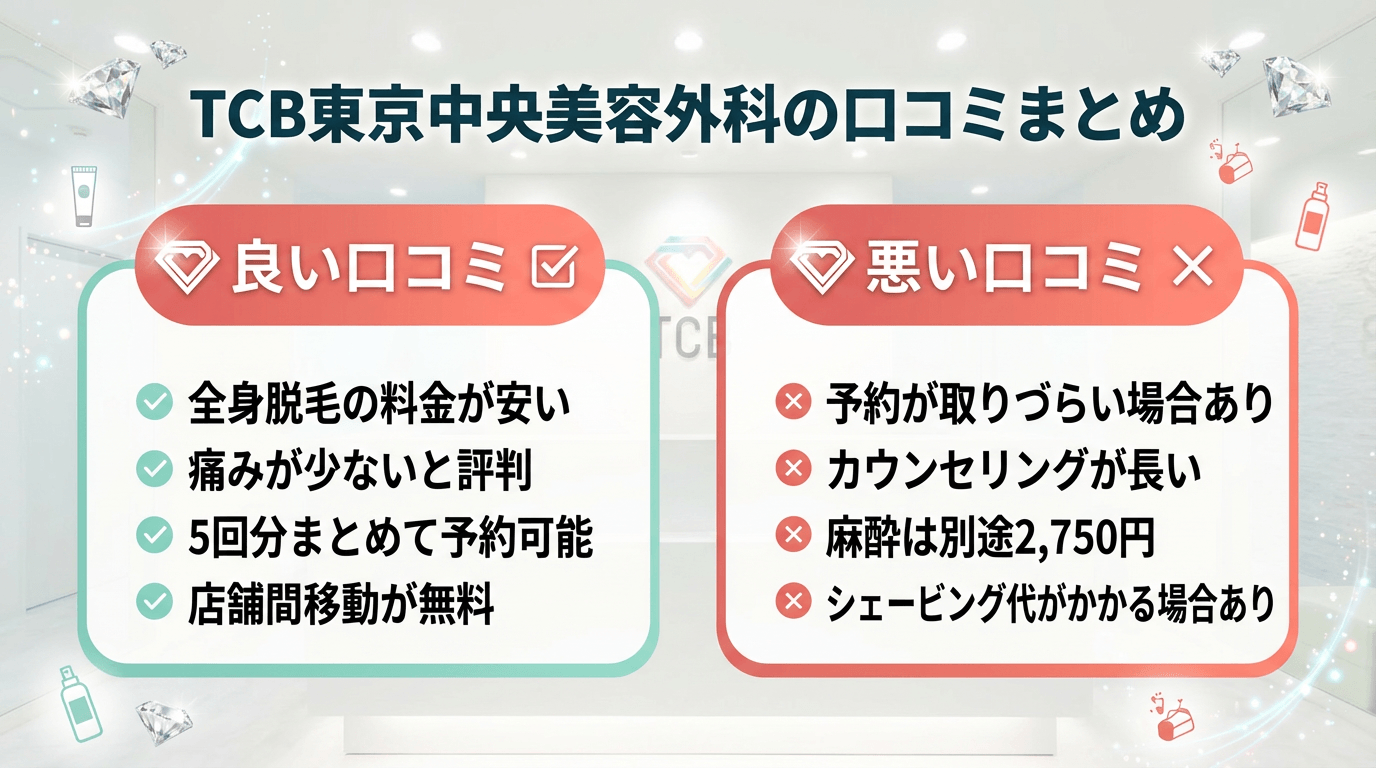 TCB東京中央美容外科の医療脱毛を検討する際、実際に通った人の口コミを知りたいという声が多いのではないでしょうか。