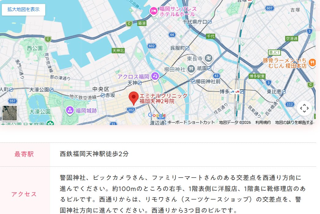 | 近くの他院 | エミナルクリニック福岡天神院・ エミナルクリニック小倉院 |