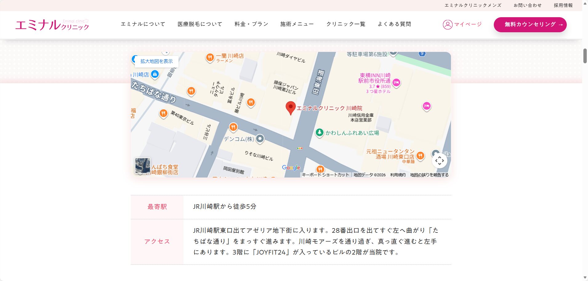 エミナルクリニック川崎院は、JR川崎駅から徒歩5分の場所にあります。