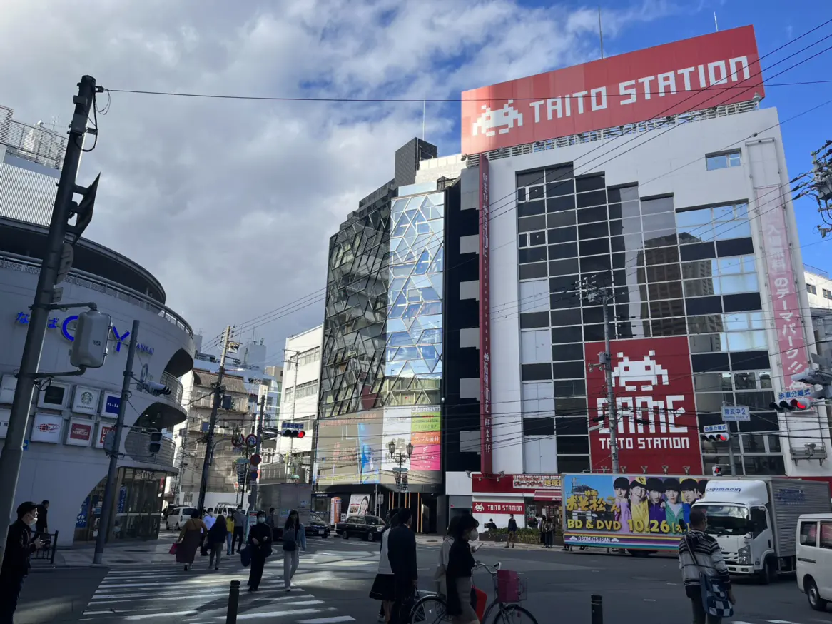 正面に赤色のビル(タイトーステーション 難波店)がございますので