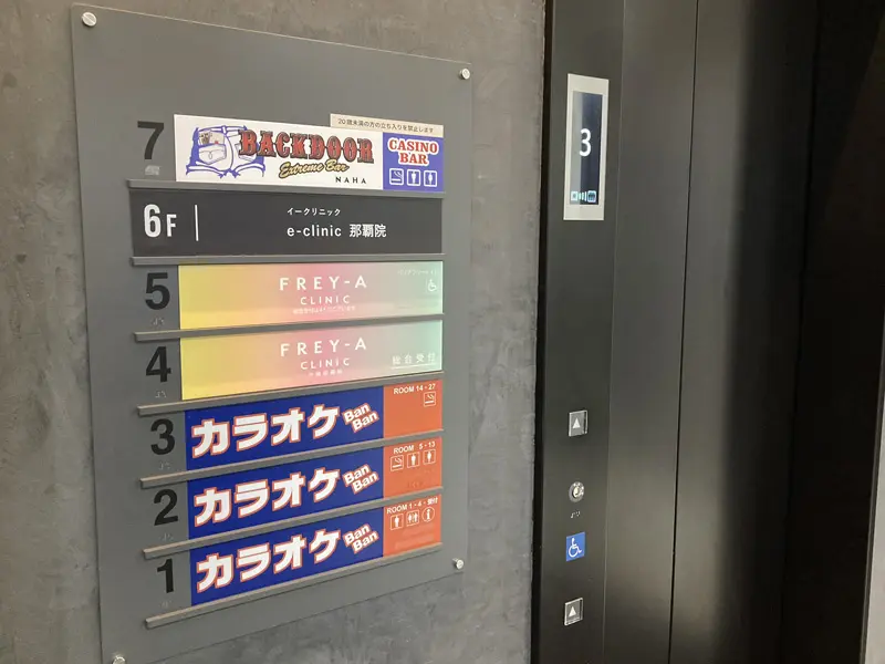 カラオケ(店名:カラオケBanBnan)が1階にある『Mビル那覇国際通り(旧:久茂地ビル)』の4階がフレイアクリニック総合受付となります。