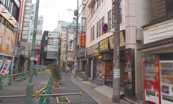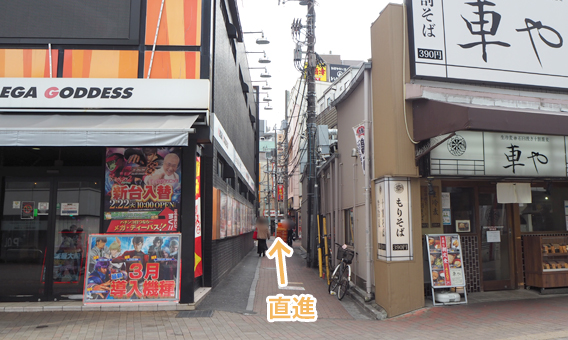 ④そのまま道なりに30mほど進むと、そば店の手前に路地がありますので、そちらへ直進します。