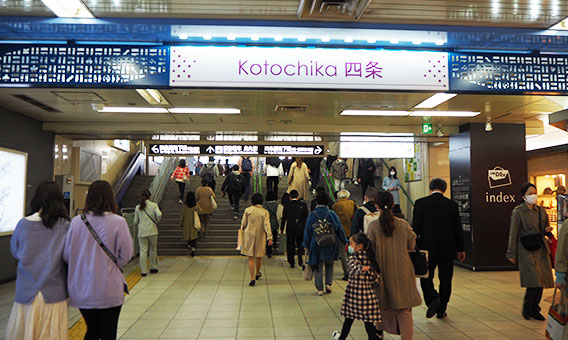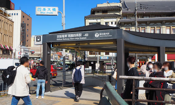 ①京阪「祇園四条駅」3番出口から地上へ出ます。