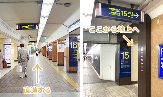 ③阪急「烏丸駅」から18番出口の方へ100mほど直進すると15番出口がありますので、そこから地上に出ます。