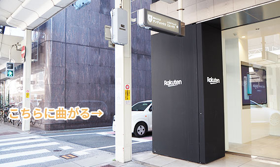 そちら側に100mほど直進し、1Fに「楽天モバイル」があるビルを目指します。