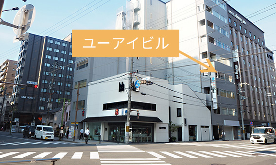 ③交差点を斜めに渡った先にある「ユーアイビル」の3Fが当院です。