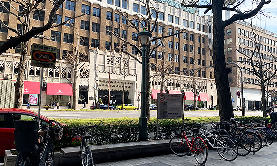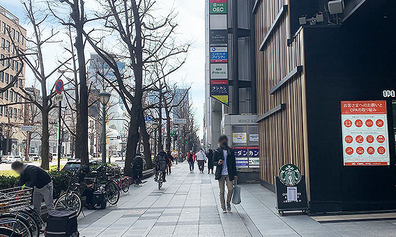 ②7番出口を出ると道を挟んで向かいに「大丸」が見えますので、「大丸」を左手に見ながら直進します。