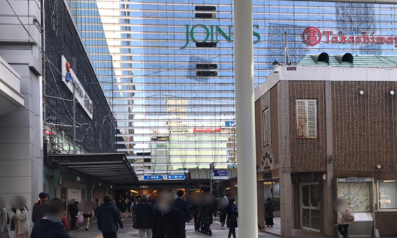 ④左へ進むと右手に交番、正面に「JOINUS」の入口が見えますので、