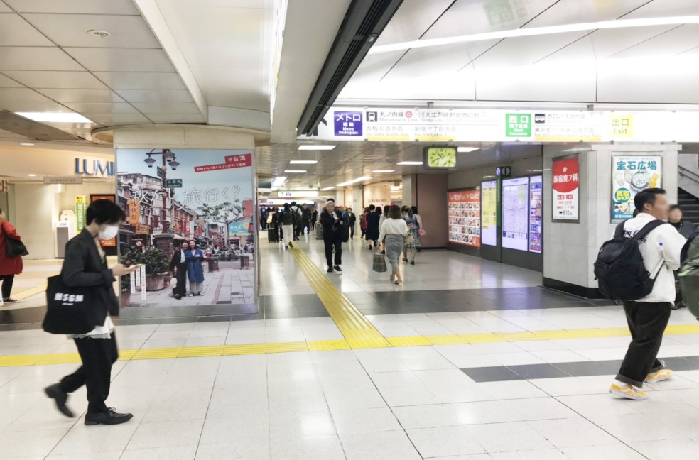 ②新宿駅東口から左に曲がり、地下通路を真っ直ぐ進んでください。突き当りにある階段を上ってください。