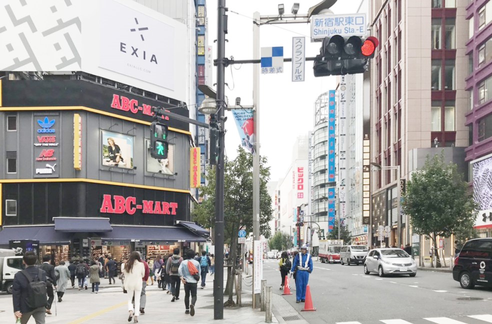 ③上り終わると「新宿東口駅前広場」に出ます。右側の交差点から「ABC‐MART新宿本店」に向かって進んでください。