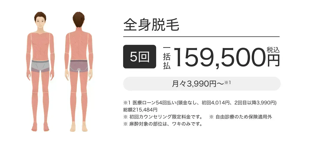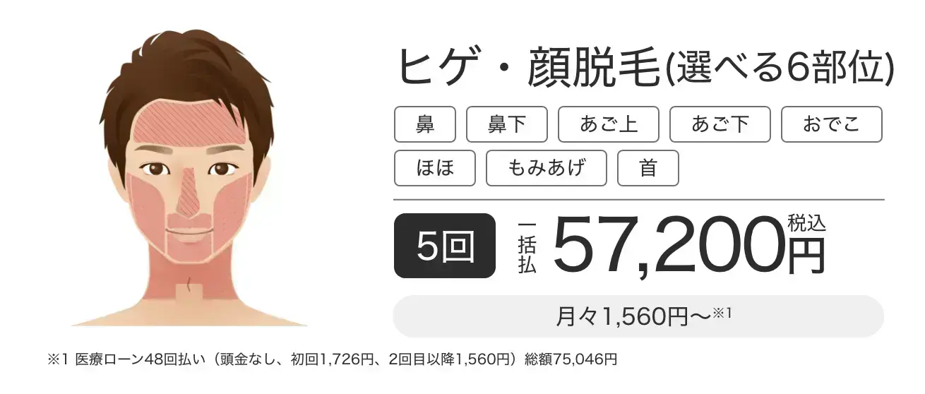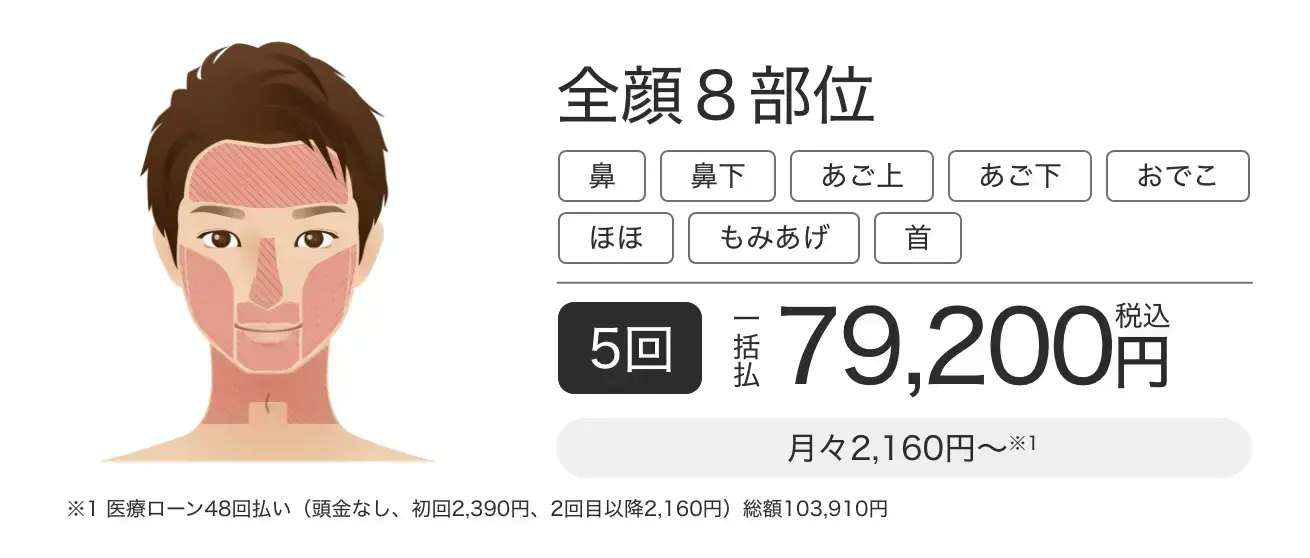 | 費用 | (4.9) | 業界最安値水準に加え、ヒゲ・ワキ・VIOの麻酔代も無料で安心 |