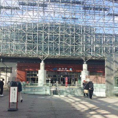 ①JR金沢駅の金沢駅前東口(鼓門)を出ます。
