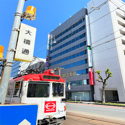 ①電停「大橋通」で下車し、大橋通を背にした正面ビル「畑山ビル」内にございます。
