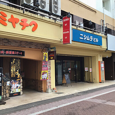 ④中央街を直進しミヤチクの大きな看板の隣にあるニシムラビルの4階が宮崎院です。