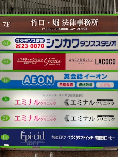 ⑤交差点の手前まで30mほど進んでいただくと右手に看板とビルへの入口がございます。奥のエレベーターでカウンセリングの方は3階、施術の方は2階までお上がりください。