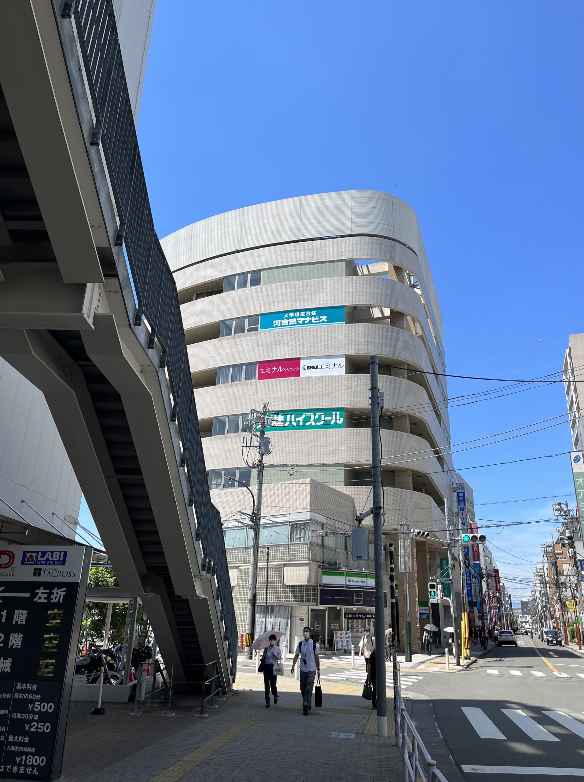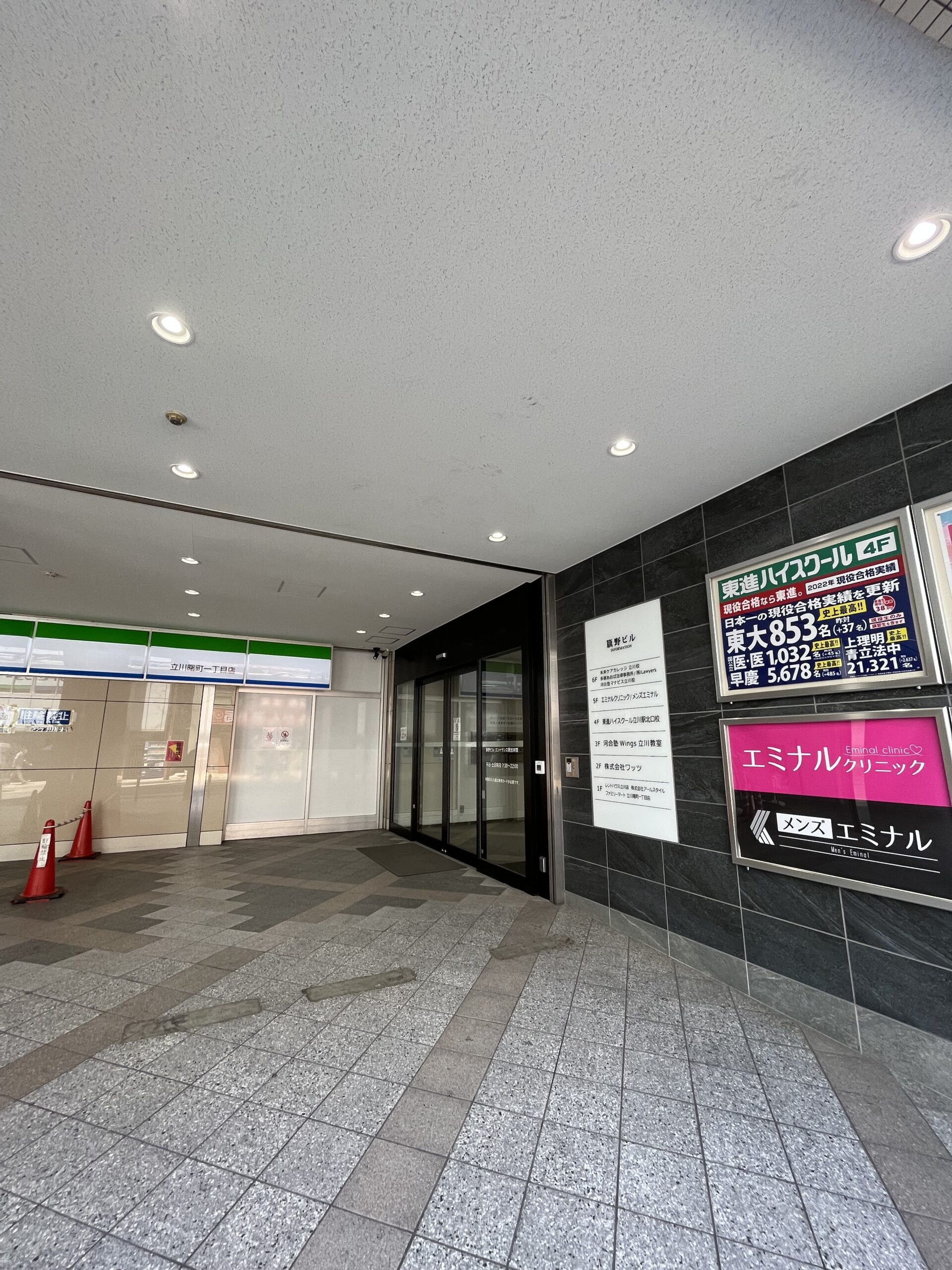③100m程進むと正面に「ファミリーマート」が1階にあるビルにメンズエミナル立川院がございます。