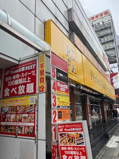 ③しばらく歩くと、左側に1Fがパーフェクトスーツファクトリーの入ったビル(上野西田ビル)があります。そのビルの5Fになります。エレベーターはビルに向かって左側にあります。