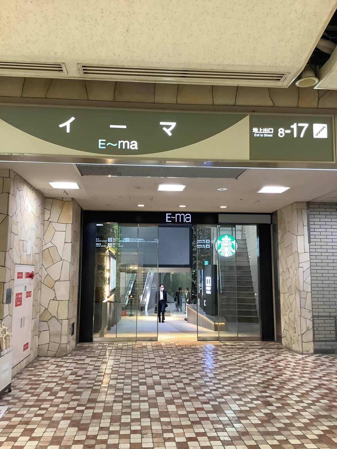 ⑥イーマの入り口です。エスカレータを上がらずビルに入ってスターバックスを通り過ぎ、さらに右奥に進むとエレベーターがあります。メンズエミナルは6階にございます。