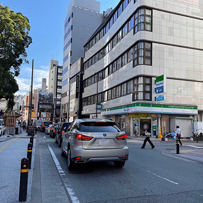 今泉公園通りを直進すると、右にファミリーマート警固公園前店が見えます。ファミリーマートの手前の道を右折し、警固参道を直進してください。