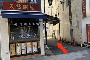 ④マツモトキヨシの右隣の角に鯛焼き屋さんがございますので、左手にして進んでいただきます。