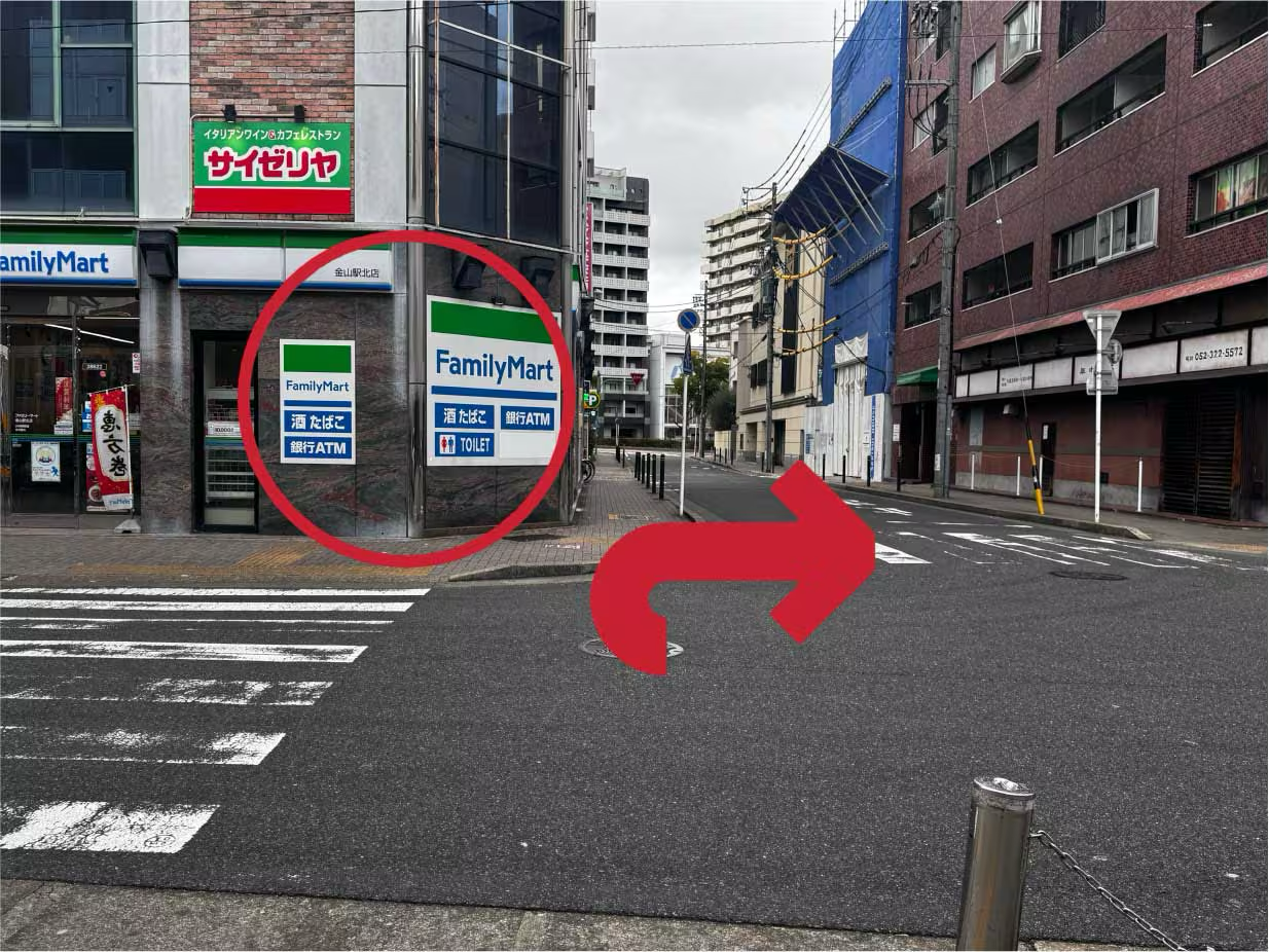 ④アスナル金山を抜けた先のファミリーマートを右に曲がります。