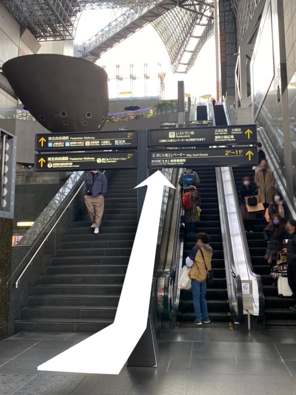 ①「南北自由通路」「レストラン街」方面のエスカレーターで2階に上がります。