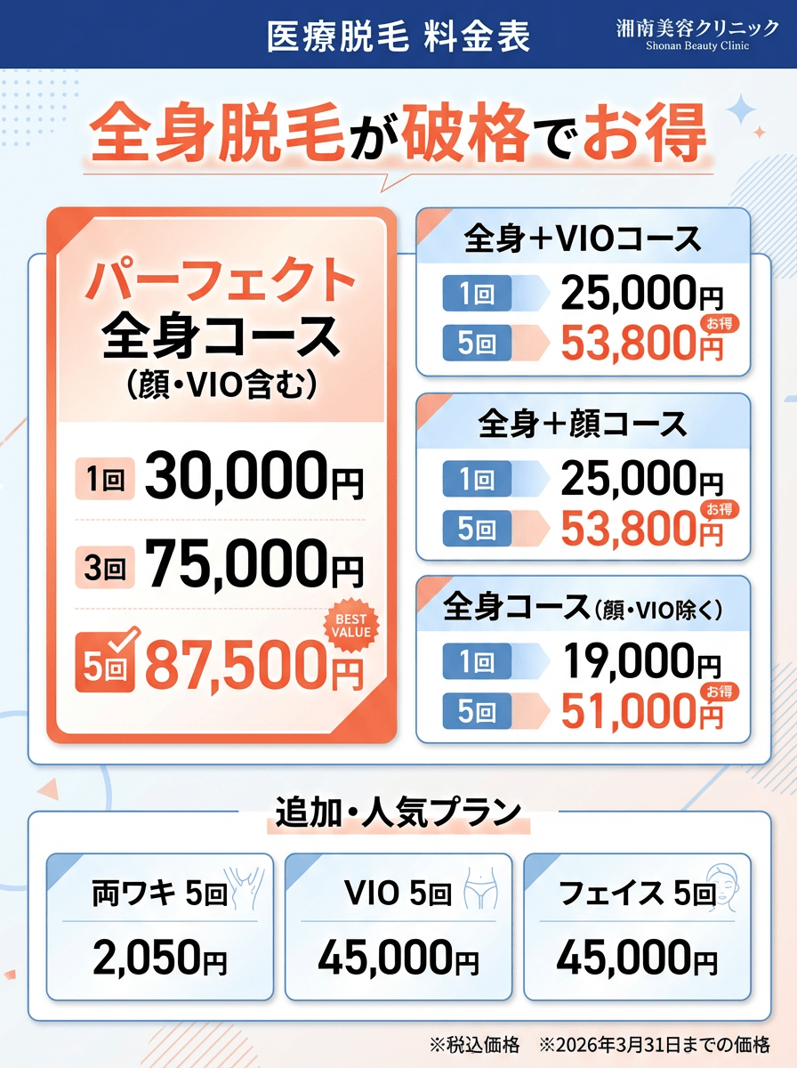 | 全身脱毛+VIO+顔 | 5回:87,500円 (パーフェクト全身) |