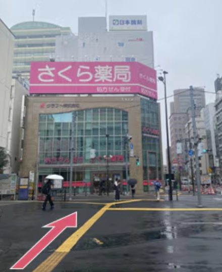 ②左正面にあるさくら薬局さんの方向に横断歩道を渡り直進します。
