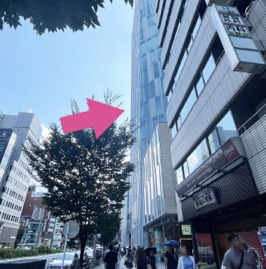 地上に上がるとすぐに見える矢印のビルを目指して歩いてください。