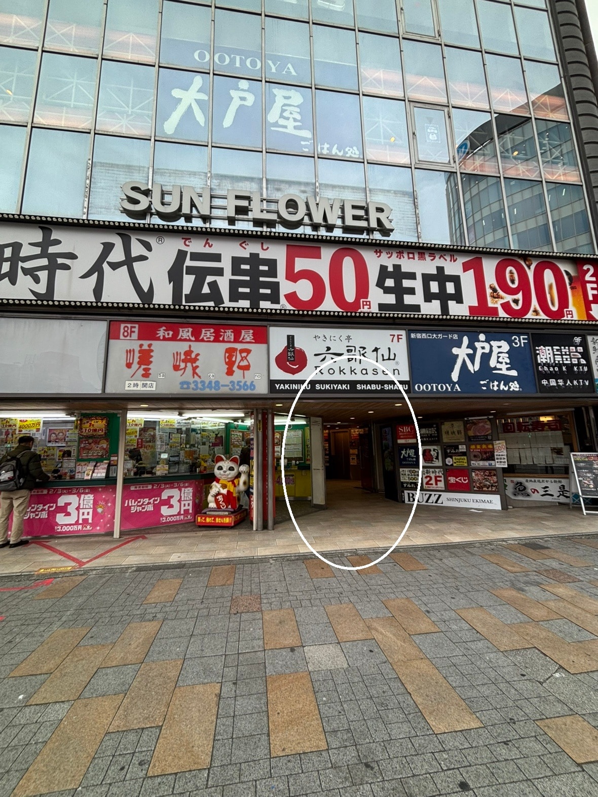 ⑦大きな交差点(新宿大ガード西)の角を曲がったところにサン・フラワービルがございます。