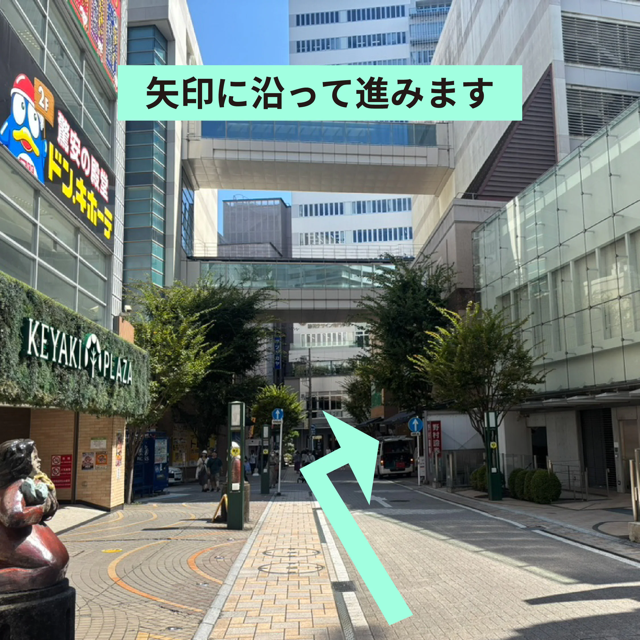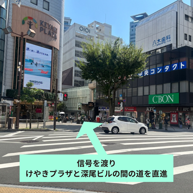 ④信号を渡り、けやきプラザと深尾ビルの間の道を進みます