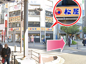 ⑦右手に見える松屋の前の横断歩道を渡ります。