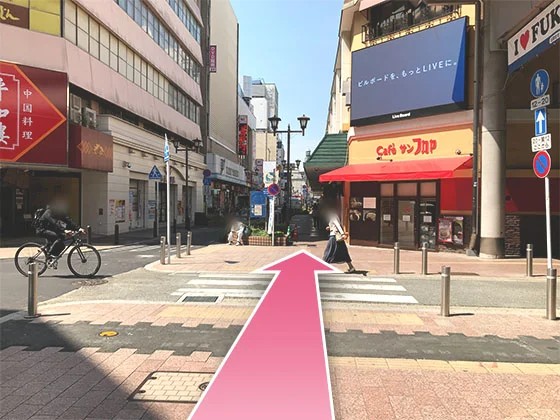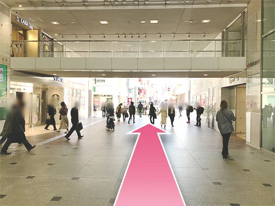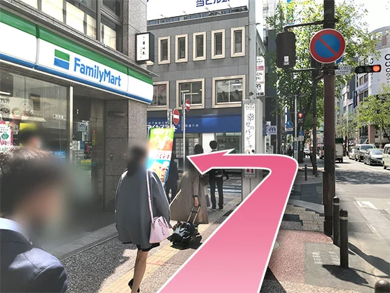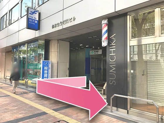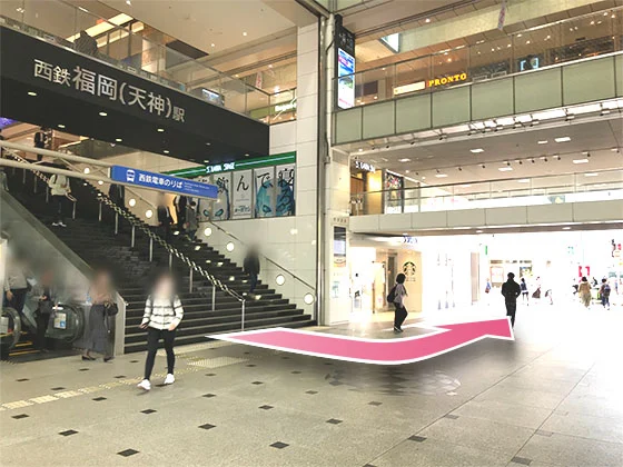 ①地下鉄空港線天神駅の2番出口から出て左に進んでください。