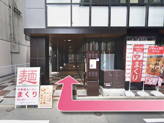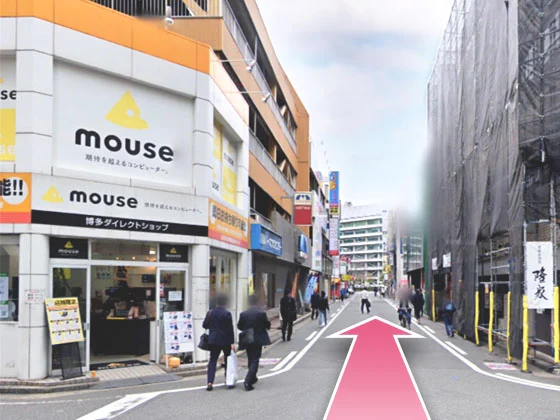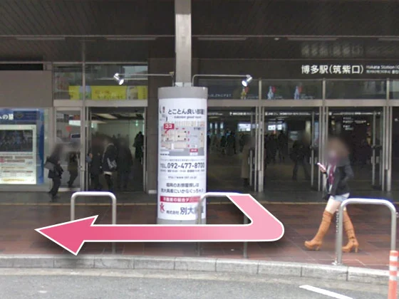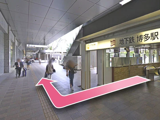 ①地下鉄博多駅西1口から出て、右に曲がってください。
