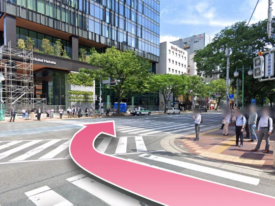Miyako Hotel Hakata側に横断歩道を渡って右に曲がってください。