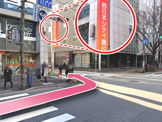 ⑦しばらく進むと西日本シティ銀行があるので、角を左に曲がってください。