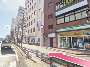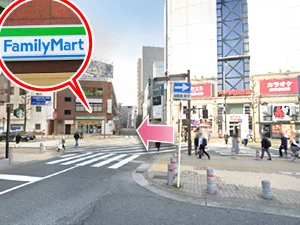 ③目の前の横断歩道を渡り、ファミリーマートの方向へ進みます。