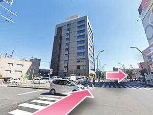 ③横断歩道の前を左に曲がってください。