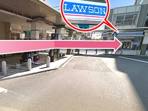③バス停の横を進み、ローソンの前を通り過ぎます。
