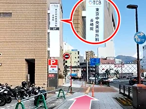 ⑦TCB東京中央美容外科長崎院の看板が見えてきますので、まっすぐ進んでください。