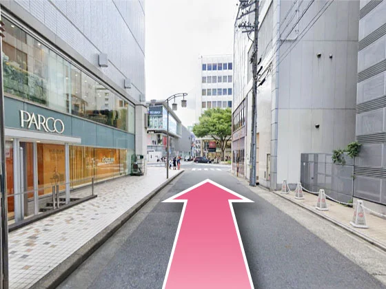 ②しばらく真っすぐ進んでください。左手のパルコが目印です。