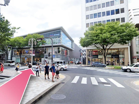 ①地下鉄名城線 矢場町駅の5番出口から外へ出て横断歩道を渡り右手側に進んでください。